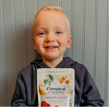 Our baby boy, born at 25 weeks, was not able to improve with bottle drinking and his intake reduced dramatically. To keep growing and avoid the constant stress of a wiggly infant pulling the NG tube, our care team decided it was time for a g-tube. We have had tube feeds since and work every day to improve. Since starting daycare, he has inched forward with oral meals. At home we supplement with Compleat® tube feeds to help meet his nutritional needs to support growth. We just turned 2, and are nearing adjusted age 2 which means less of a need for milk, and just maybe thanks to Compleat®, our sweet boy’s tube journey is nearing an end as he eats and explores new foods every day.